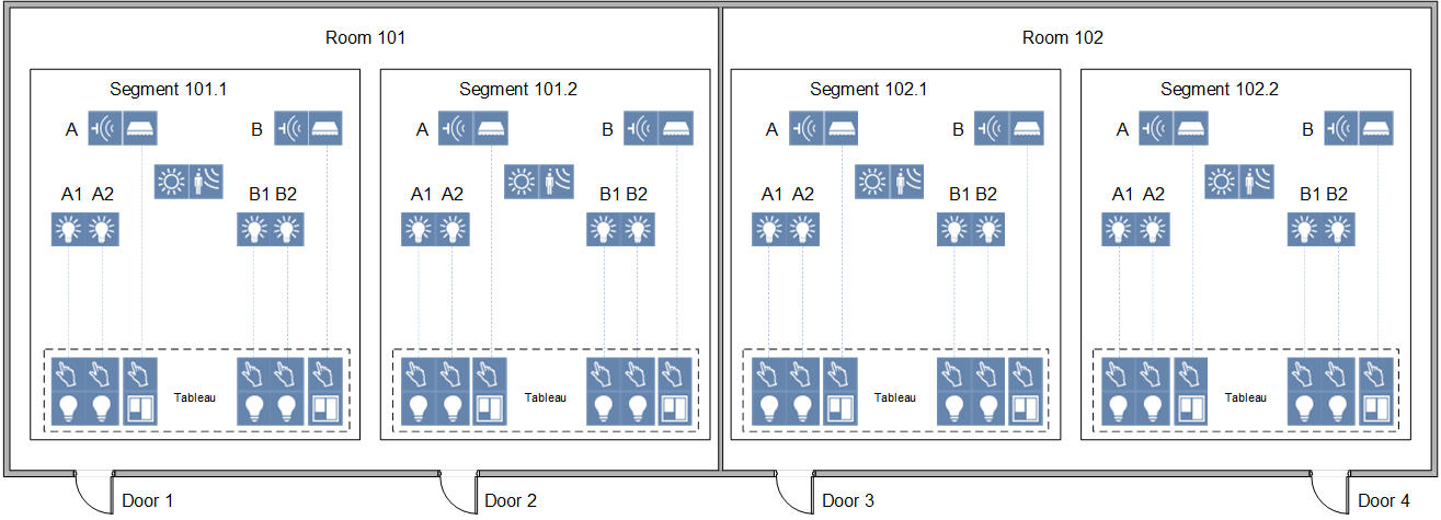 Scenario: You have two rooms, each with 2 segments, controlled by the operator panel on the applicable door. Moving the separating wall creates a room with 3 segments and one room with 1 segment. Only the individual, applicable segment can be controlled by the operator panel on the door.
